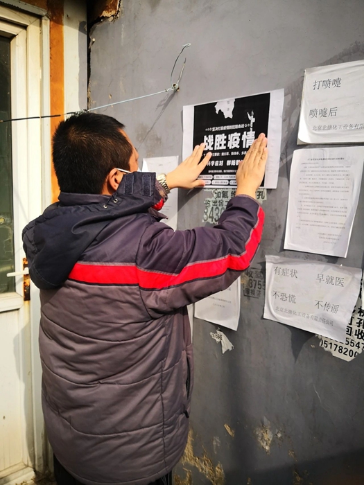 为了将社区防控真正落实落细,化实厂党总支经过研究,迅速成立以总务部为核心的疫情防控小分队。准确掌握住户的信息是防控的关键,化实厂总务部3位同志放弃休息,全员到岗,与街道、社区的工作人员一起入户,逐户排查、登记、宣传防控要点、在院内张贴宣传材料,确保宣传到户、宣传到人。