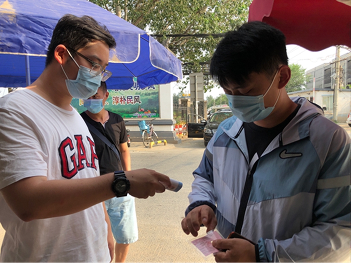 新三余村外来人口较多,进出人流量大,值守检查不能有丝毫的马虎,在做好自身防护的情况下,认真检查进出人员的出入证与身份证、测量体温、并做好登记工作。