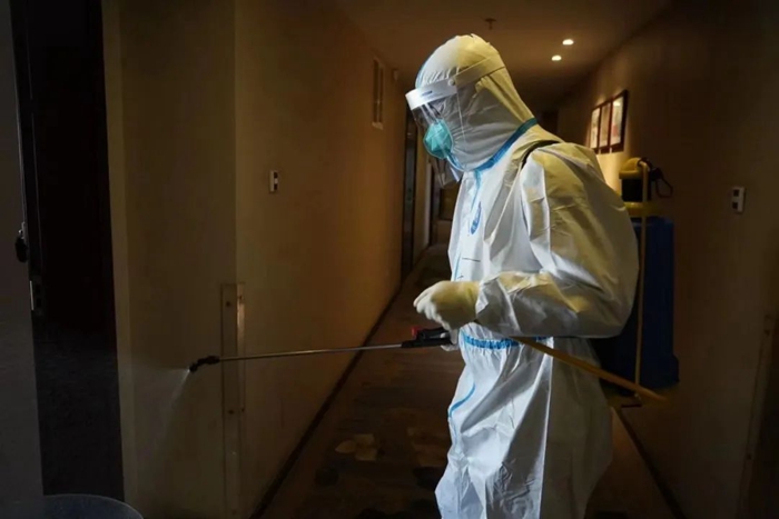 每天深夜,当宾客们沉沉睡去,闭环服务人员还要进行垃圾消毒清运工作。众所周知,垃圾是病毒最容易传播的媒介,为防止疫情传播,闭环人员要对一袋袋垃圾进行全面消杀,然后再手动一袋袋地将垃圾送至目标场所,垃圾的异味常常令服务人员一阵阵作呕,但大家没有一句怨言。