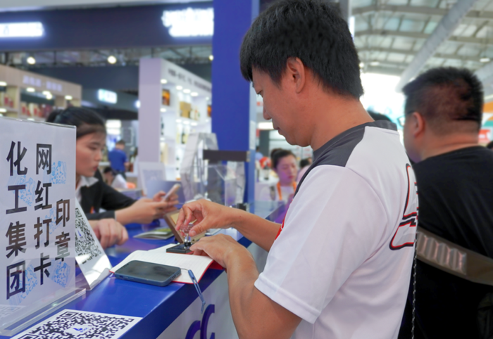 网红打卡印章,是此次参展的又一亮点,集团为此专门制作了有集团名称楼宇的印章。“4号馆,北化集团,3免(3个印章、免费)”的服贸会攻略已在“小红书”上传开,人们纷至沓来,在关注集团微信公众号后,将“半岛bandao化工集团”印在自己的本上,让半岛bandao化工在潜移默化中传播。